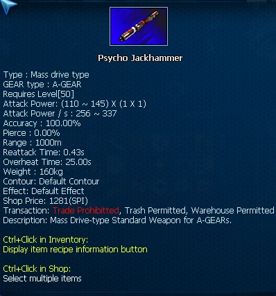 Psycho Jackhammer is an event Jackhammer and is obtained through a special recipe using a Mad Clue. It is fixable and enchantable but is not sought after because its stats are mediocre.